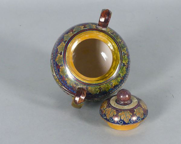 decorated and colorful with motifs of flowers, bunches of grapes and female faces. Signed S.A. New Cooperative of Ceramists Gualdo Tadino. The inside of the lid has minor defects. Height 12 cm.