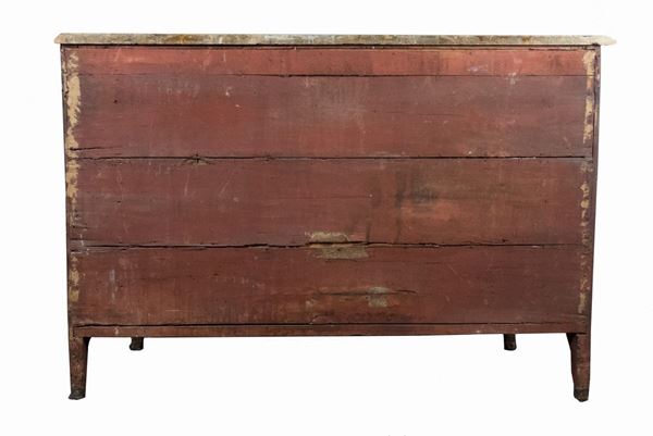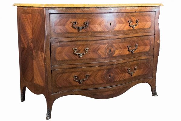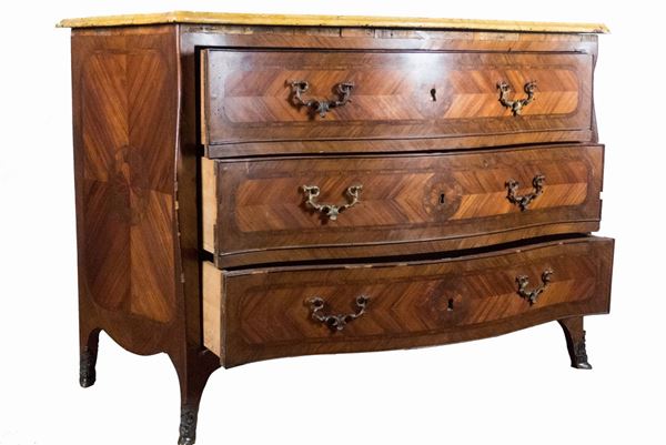 with inlays with motifs of rosettes and piping in bois de rose, in a rounded shape with three drawers, bronze handles and top in yellow Siena marble. Defects on the cabinet and on the marble top. Measure cm. 142 x 68 x 97 h.