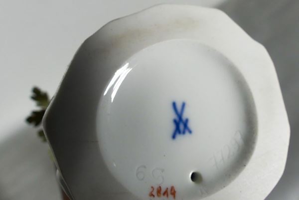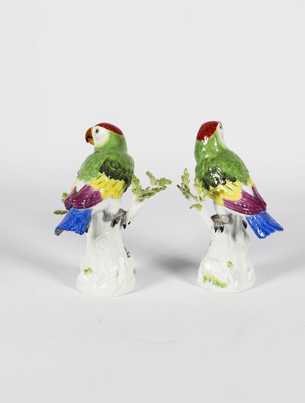 Pair of small sculptures in polychrome and enamelled porcelain Meissen "Parrots on tree trunks"