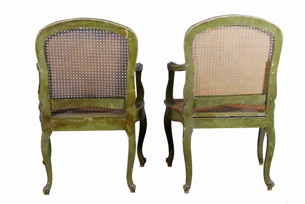 in gilded and green lacquered wood, curved armrests and legs and cannetè covers. Measure cm. 64 x 57 x 98 h.