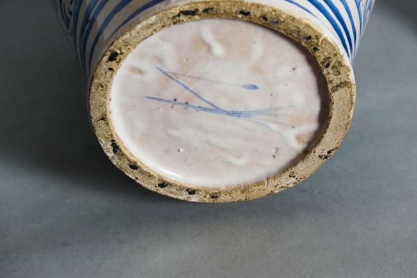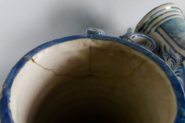 entirely decorated in blue on a white background with landscape motifs with figures, curved handles and lids. A vase has breaks in a handle and at the edge of the neck. Height cm. 45 each.