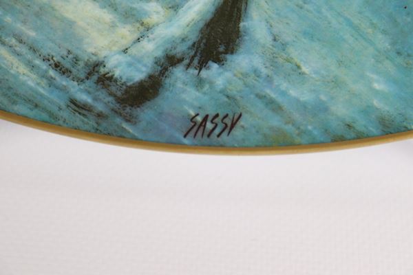one in ceramic decorated with silver coating, mounted on a wooden panel, the other in porcelain signed Aligi Sassu. Multiple edition 554/2500. Maximum size & nbsp; 45 x 45 cm.