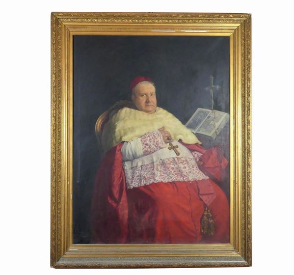 "Portrait of a Cardinal in an armchair". Signed and registered in Rome 1884