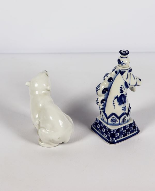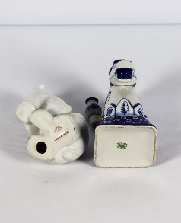 of a bottle in the shape of a horse's head with blue decorations on a white background and a small sculpture "Polar Bear". Maximum height 17 cm.