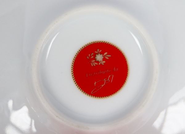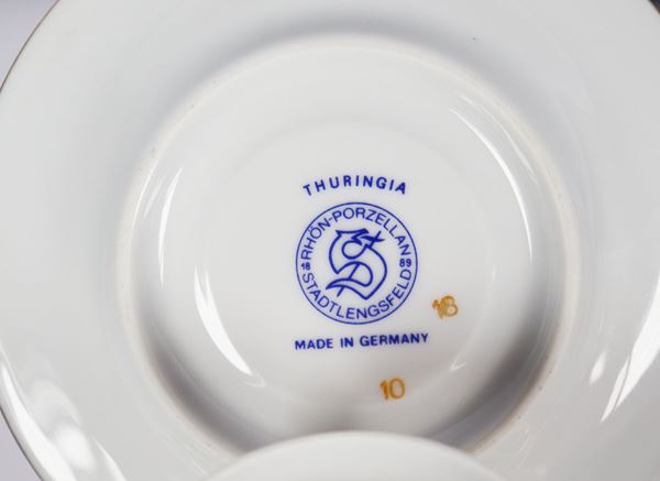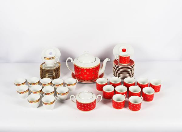 of twelve coffee cups with saucers with decorated band on the edges and a coffee service & nbsp; red background with flower decoration consisting of: coffee pot with placemat, sugar bowl and twelve cups with saucers. Maximum height cm. 16.
