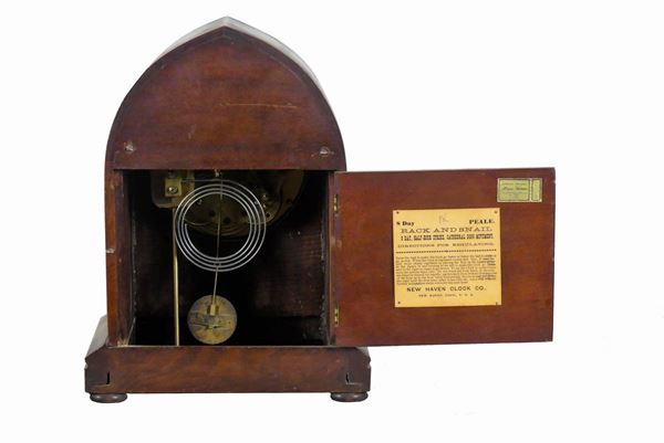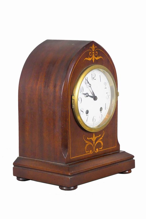 in the shape of a cathedral with thread and scroll inlays, white enamel dial, it strikes the hour and half hours with bell tolls. To be revised. Measure cm. 24.5 x 17.5 x 32 h.