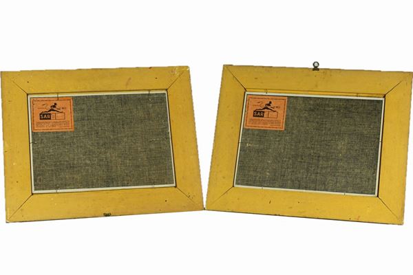 pair of oil paintings on canvas applied to cardboard, red lacquered frames with golden decorations. Measure cm. 25 x 35 each.