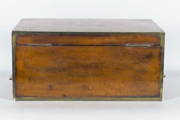 with inlaid threads in bois de rose, in the shape of a casket with handles and trimmings in gilded metal. Slight flaws. Measure cm. 44.5 x 26.5 x 21 h, open cm. 44 x 44 x 42.5 h.