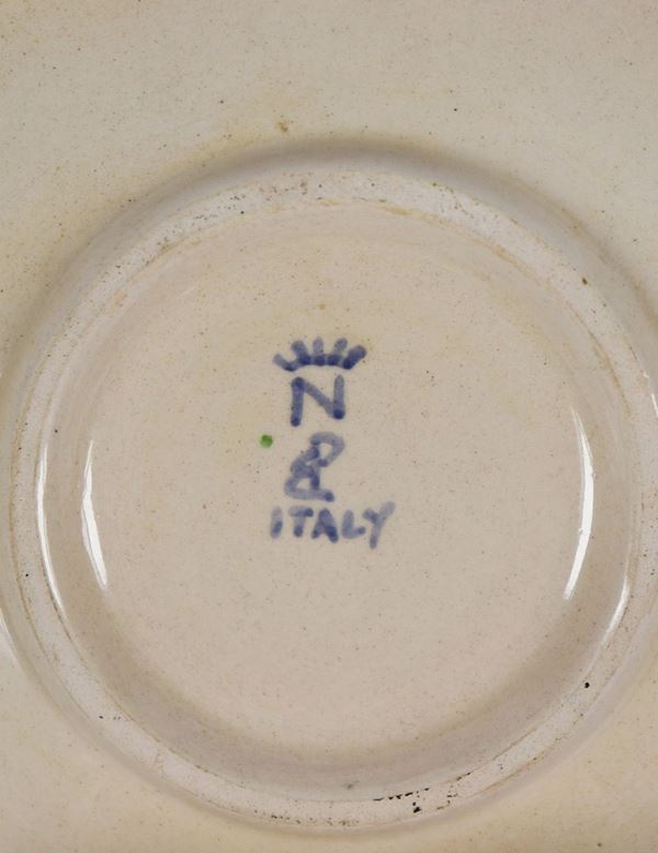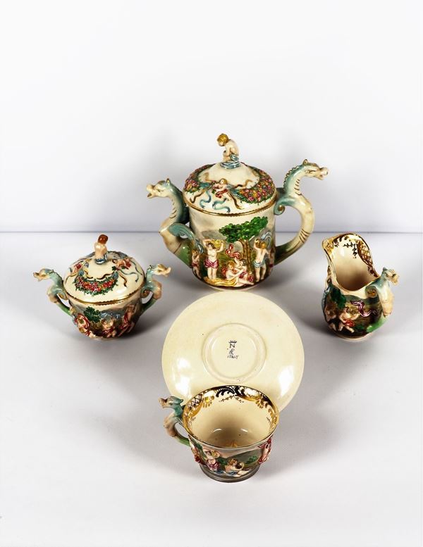 with polychrome decorations of putti in relief, consisting of: coffee pot, sugar bowl, milk jug and a cup with saucer. Maximum height cm. 24.