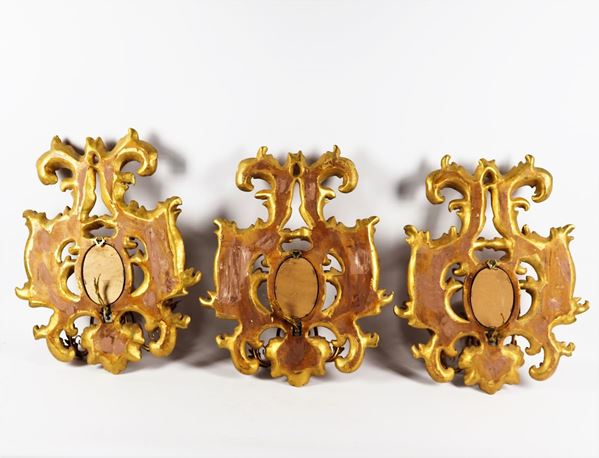 entirely carved with motifs of volutes of acanthus leaves and shells, in the center a small round mirror, three lights each. Measure cm. 43 x 56 h each.