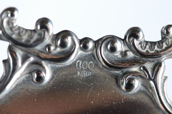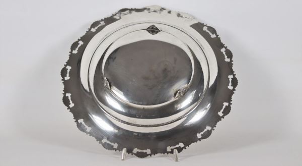 with chiseled, embossed and perforated edge supported by three curved feet, diameter 31 cm.