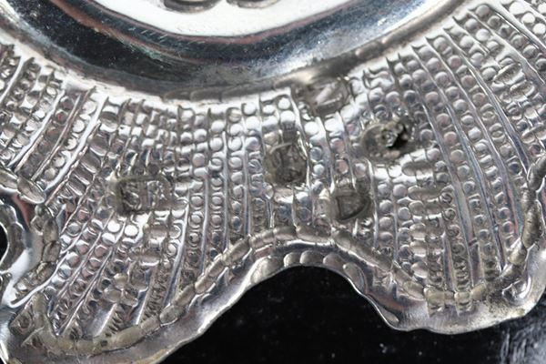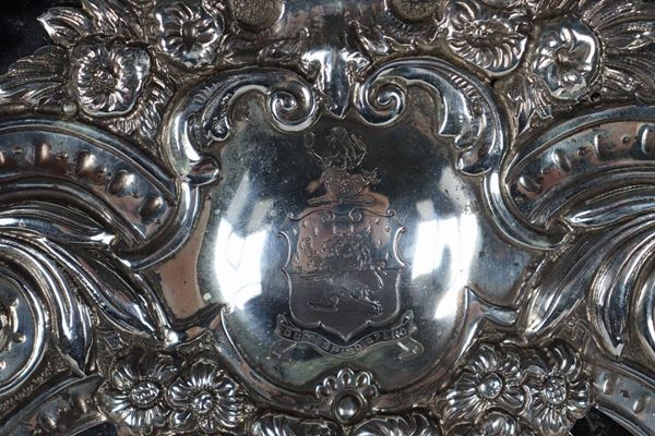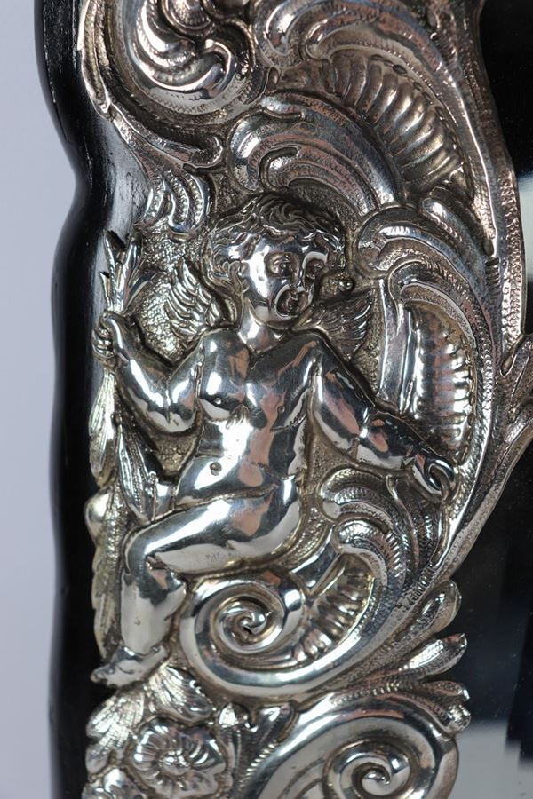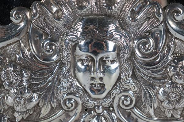 richly embossed and chiseled with motifs of volutes of acanthus leaves, cherubs and flowers, cm 49 x 71 h.