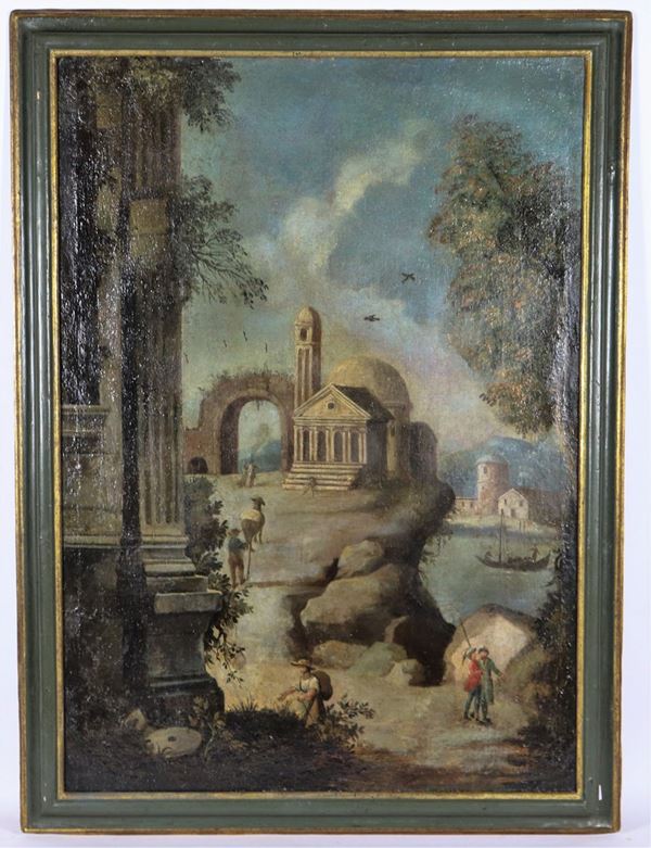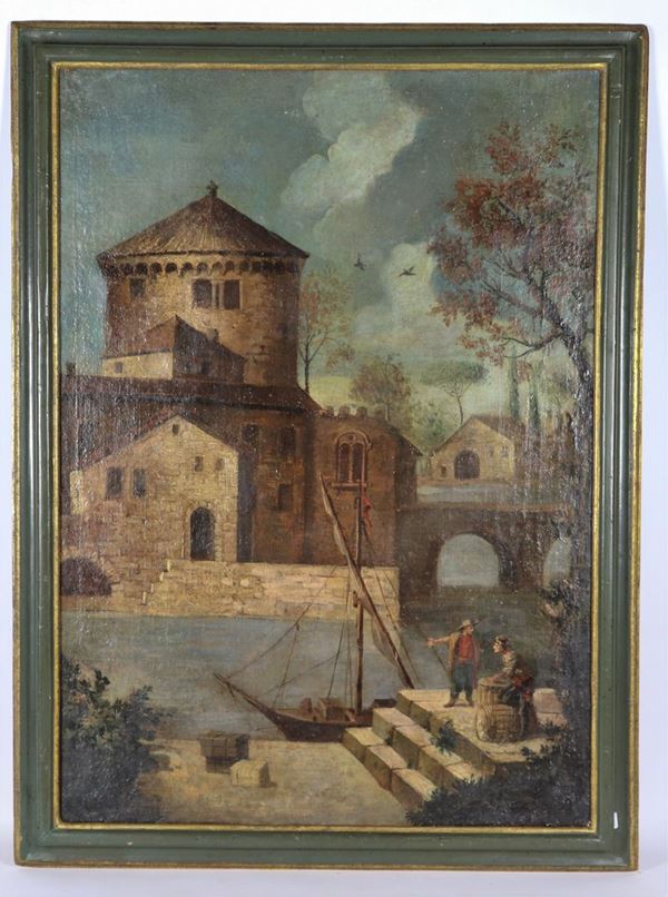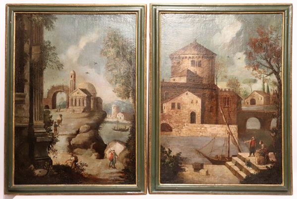 "Views of villages with ruins, harbor and characters" pair of oil paintings on canvas