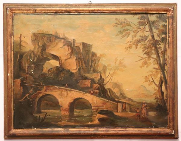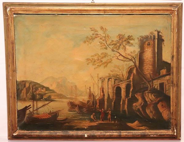 "Landscape with bridge and watercourse and small port with boats, fishermen and ruins" pair of oil paintings on canvas