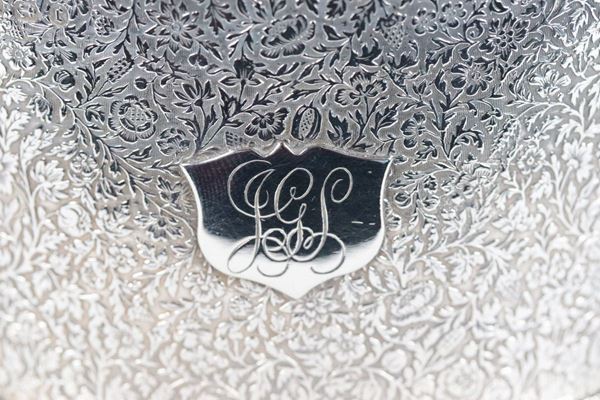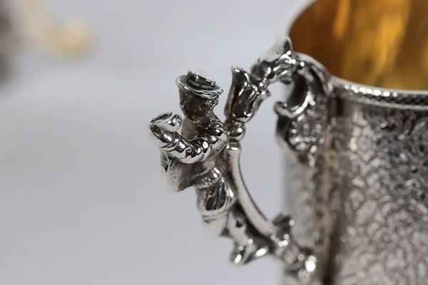 entirely chiseled and embossed with floral scroll motifs, consisting of: teapot, milk jug and sugar bowl. & nbsp;