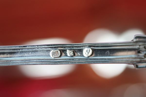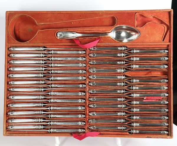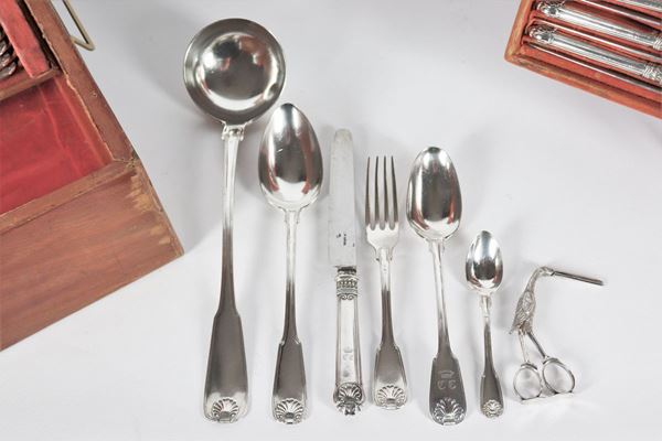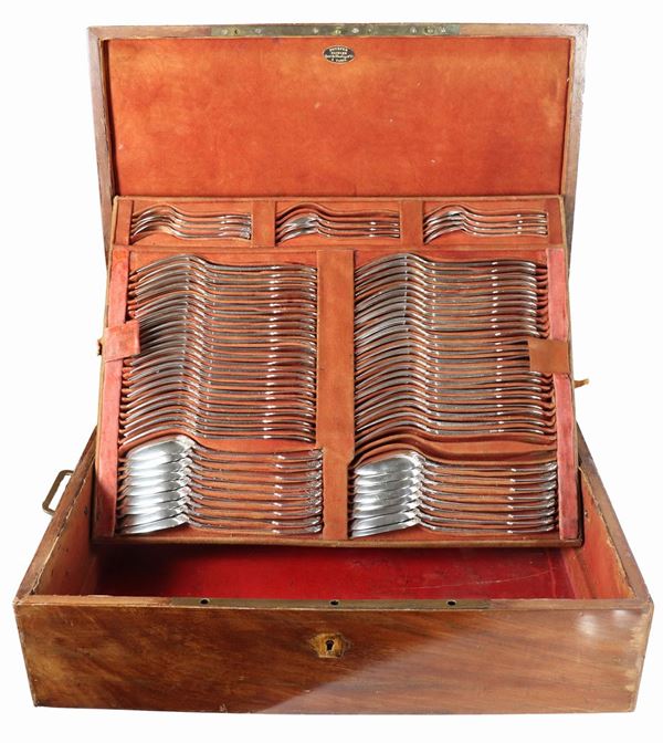 chiseled and embossed with shell motifs with engraved noble crown with monogram on the handles, consisting of: 18 spoons, 48 large forks, 48 large knives, 12 tea spoons, 1 ladle, 2 serving spoons and 1 grape scissors, enclosed case original in mahogany.