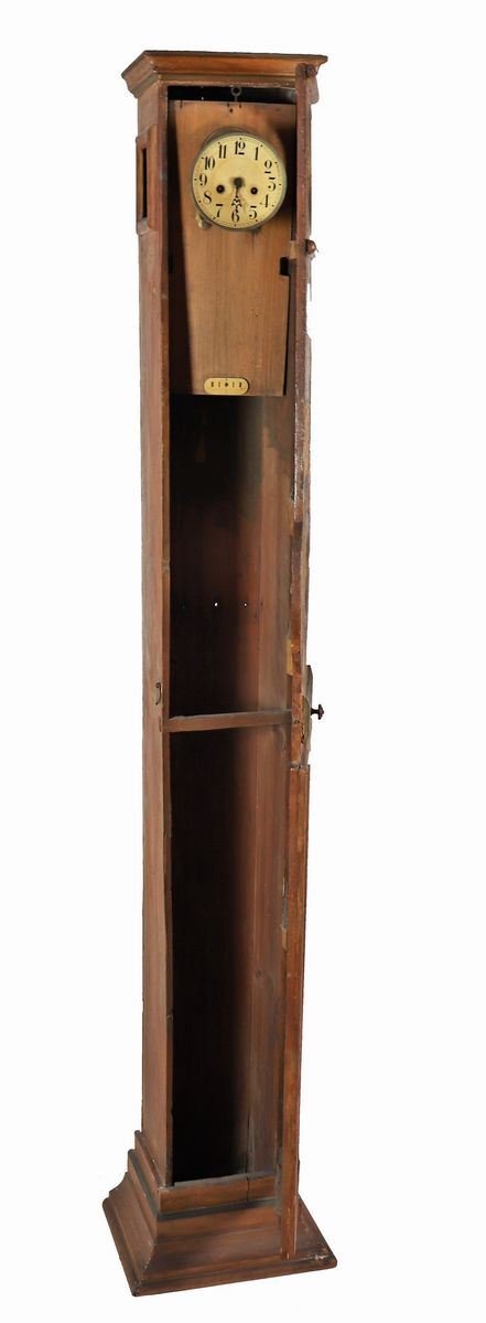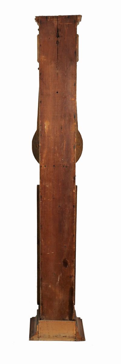 with fruit wood case and colorful front with heron figures, decorated copper dial. Defects and non-functioning machinery to be overhauled, cm 38 x 27 x 201 h.