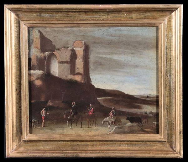"Landscape with ruins and the flight into Egypt" small oil painting on canvas