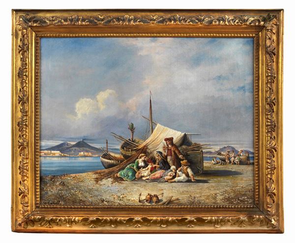 "Marina with the Gulf of Naples, Vesuvius and the rest of the fishermen". Signed. Oil painting on canvas