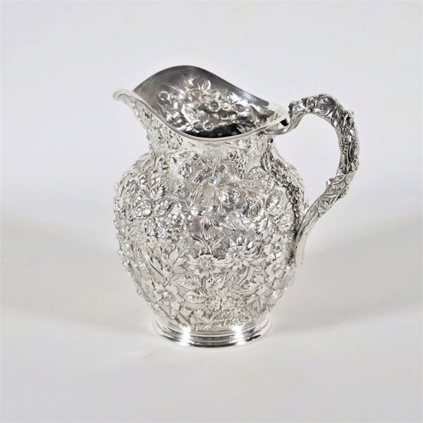entirely and richly embossed with motifs of flowers and bunches of grapes, height 22 cm.
