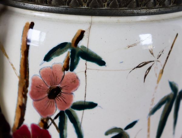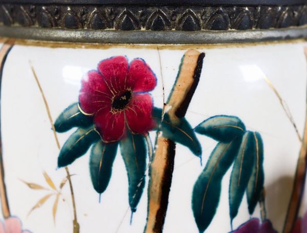 decorated and painted with oriental flower motifs, transformation to electric light. Defects and one lamp has cracks, height 38 cm each.
