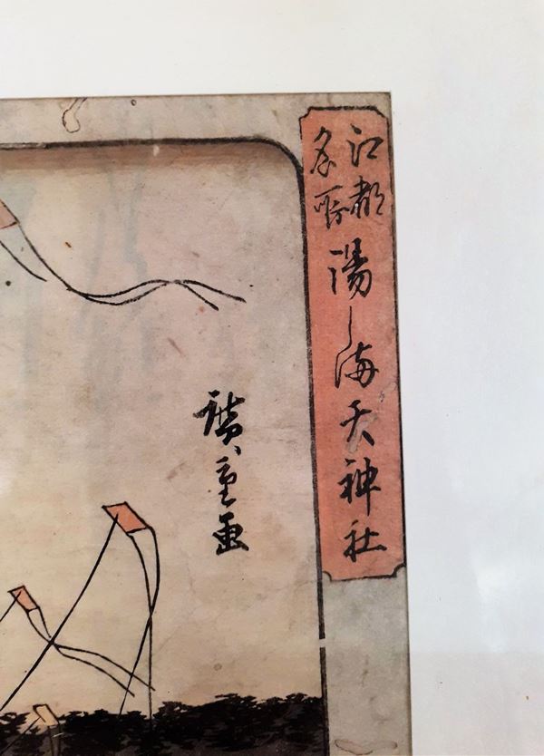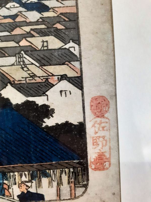 Ancient Japanese drawing in ink and watercolor on paper "Oriental life scene". Signed.
