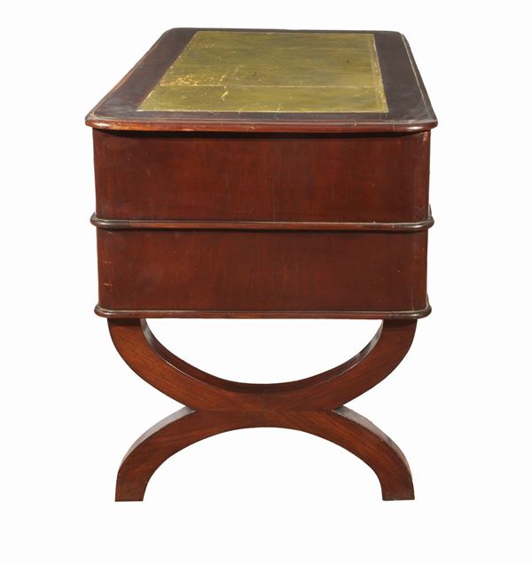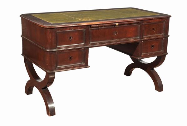 with five drawers, sliding top, crossed legs and top in defective green leather, 132 x 67 x 78 h.