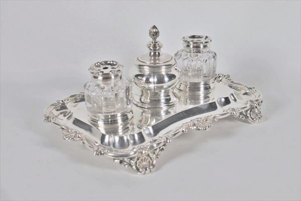 Large embossed silver inkwell from the Queen Victoria era. Argentiere R.E.A.