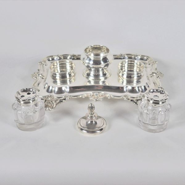 entirely chiseled with arched motifs with leaves and shells, small potiche in the center and two flacons in worked crystal, 33.5 x 23 x 17 h. Gr. 1200 net.