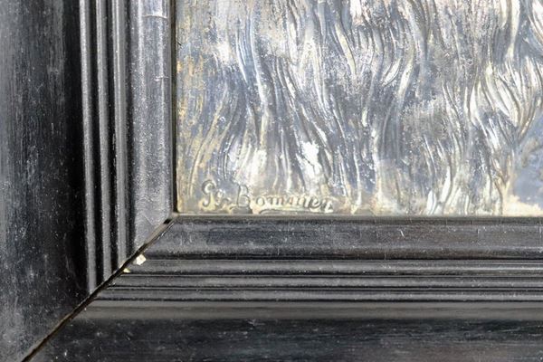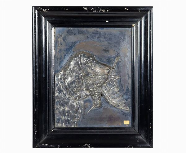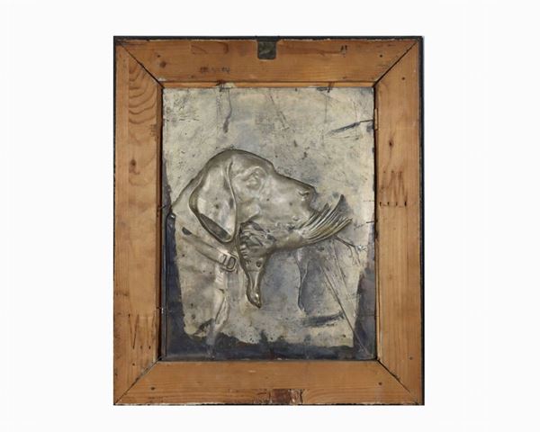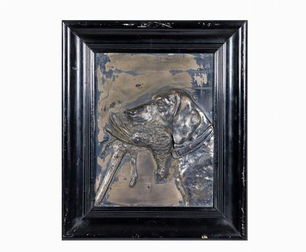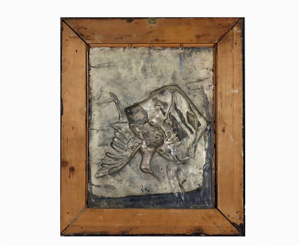 Pair of antique French high-reliefs "Hunting dogs with game" in patinated and bronzed metal. Signed