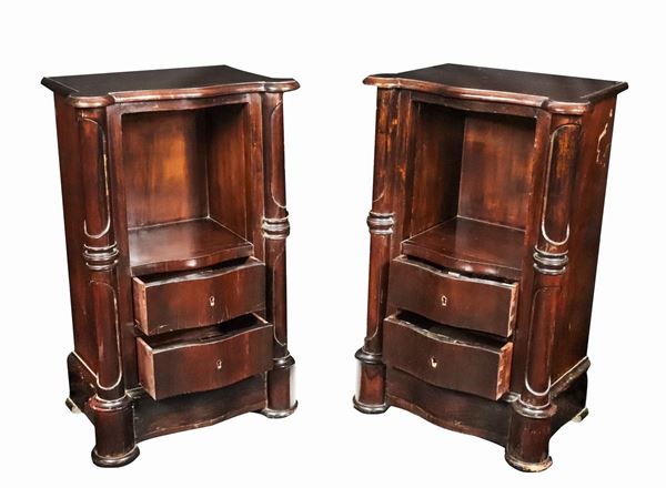with central open compartment, two drawers below and uprights with turned columns, cm 50 x 33 x 79 h each.