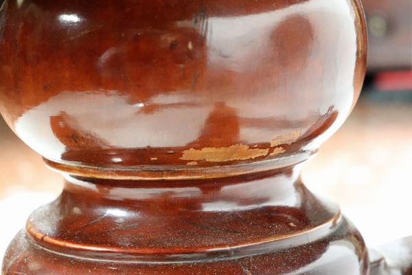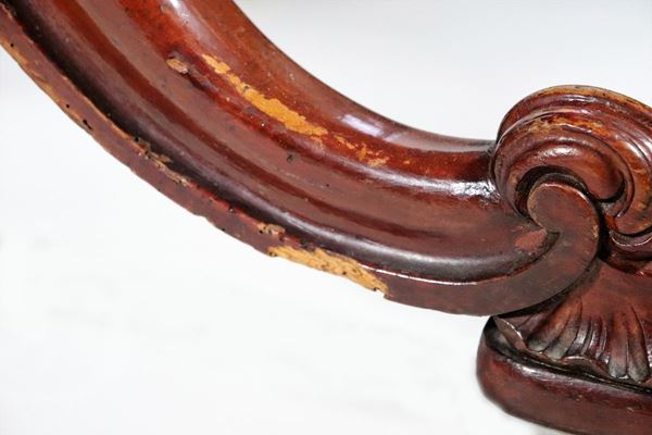 with a turned and carved column base, supported by four curved legs. The top is made up of two crescents, diameter 121 x 78 cm h.
