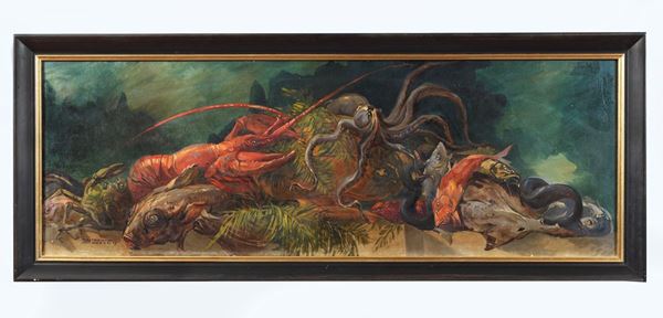 Signed and dated. 'Still lifes with crustaceans, fish and game' pair of oil paintings on canvas