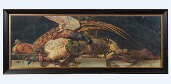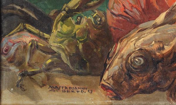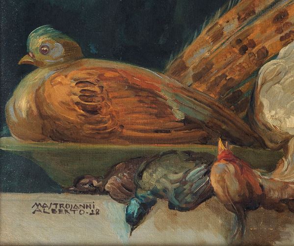 Alberto Mastroianni had as his first teacher his father Domenico, painter and sculptor; he attended the Academy of Fine Arts and spent whole days sketching animals with a satirical vein, because in them he found harmony and the relationship between line and content. In 1928 he moved to Rome where he remained until his death. He held various personal exhibitions obtaining great success for his ironic and pleasantly odd painting. Ebonized wood frames, 44 x 124 cm each.