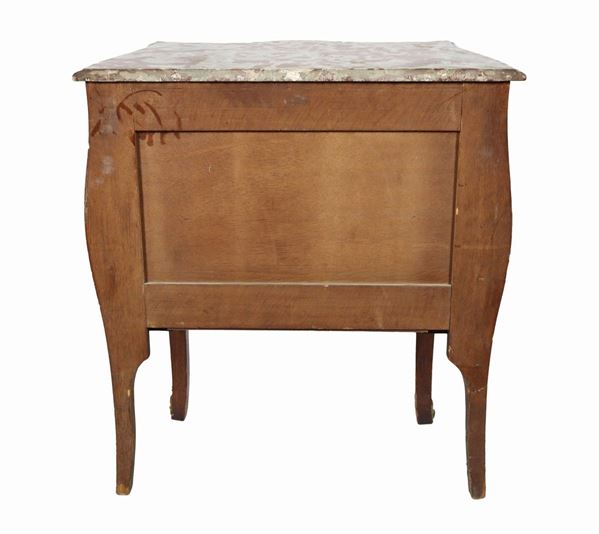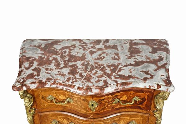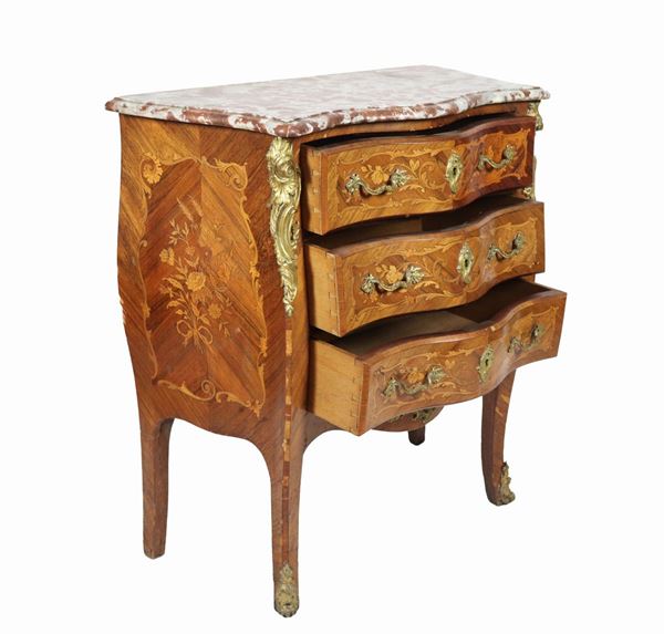 curved shape with inlays in satin wood and bois de rose with floral intertwining motifs and bunches of flowers, three pulls, gilt bronze trimmings and four curved legs. Brecciated marble top, 77 x 38 x 85 h.