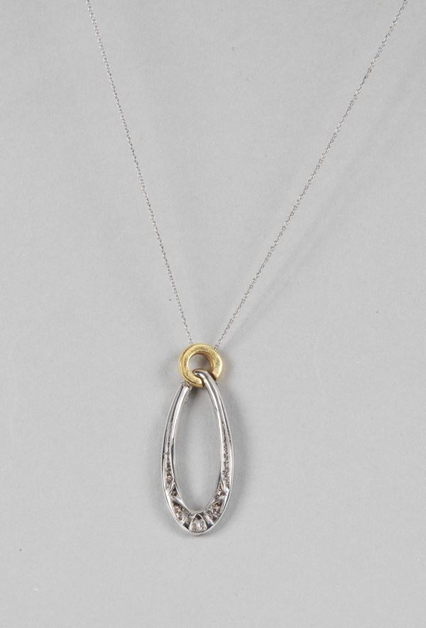 750 white gold necklace with oval pendant in white gold and yellow gold with brilliant cut diamonds pave. About 8.80 grams - Ct. About 1.50.