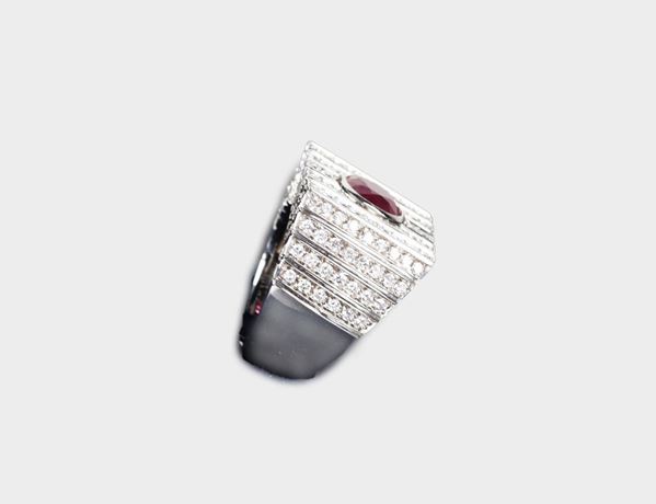 750 white gold ring with central ruby and brilliant cut diamonds pave. Approx. 17.50 g, Ruby Ct. About 2.50, diamonds Ct. About 2.30. Measure [..]
