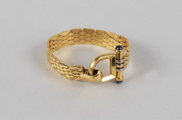 750 yellow gold soft link bracelet with 2 cabochon-cut semiprecious gems. Approximately 42.30 grams