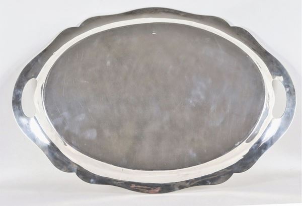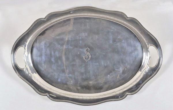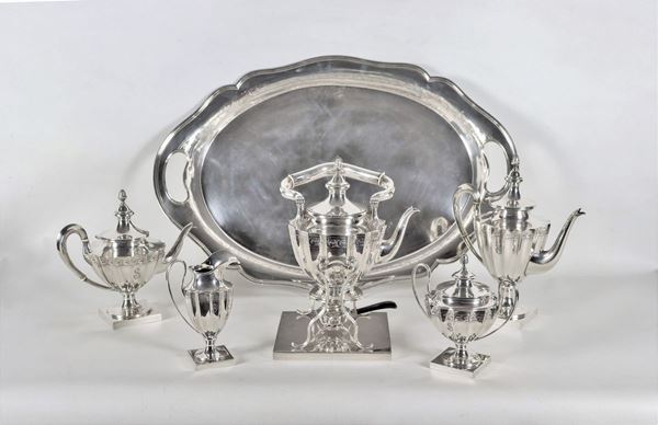 embossed and chiseled with facets and floral band with engraved monogram, consisting of: samovar, teapot, coffee pot, sugar bowl, milk jug and oval arched tray. Tray 69 x 47 cm, maximum height 36 cm.
