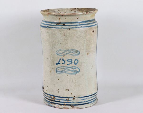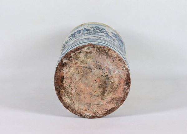 Albarello in glazed majolica with decorations painted in blue with landscape motifs, edge with restorations