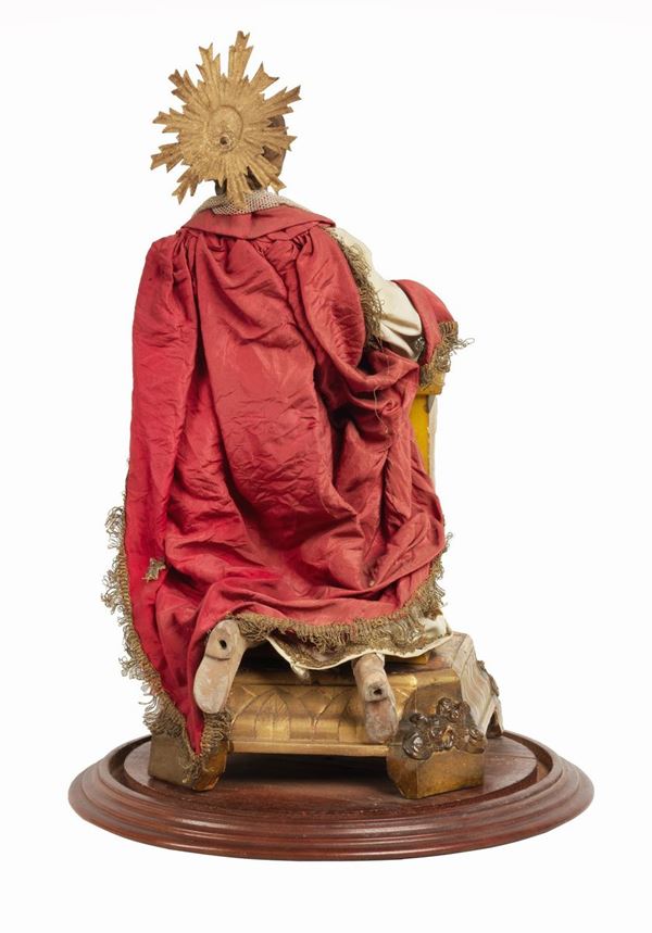 Ancient Neapolitan sculpture "Madonna with kneeler" in terracotta with walnut base and blown glass bell
