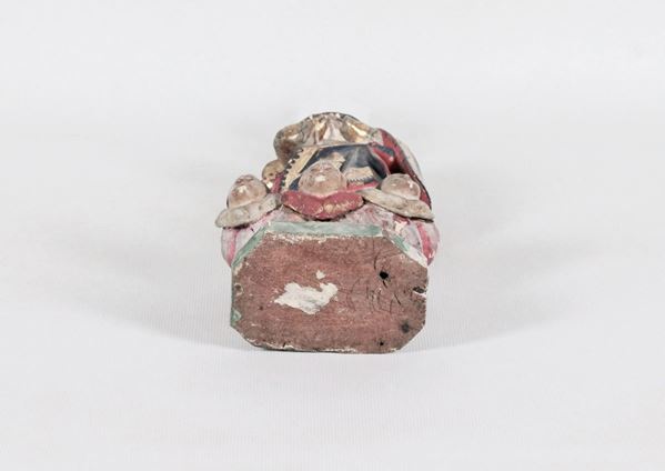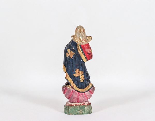 Ancient small sculpture "Madonna" in polychrome wood, defects and shortcomings