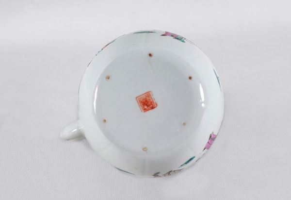 Antique Chinese porcelain teapot with colorful decorations in relief enamels with oriental life motifs