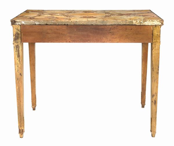 Antique console in gilded wood of the Louis XVI line with carvings with motifs of leaves and palmettes, top in veneered brecciated marble