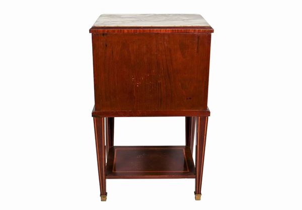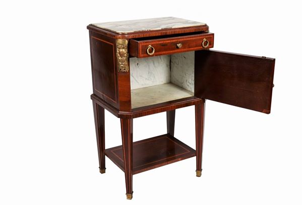 with inlays in satin wood with thread and bow motifs, friezes in gilded and chiseled bronze. A drawer, a door below with a compartment inside covered in marble and four legs in the shape of an inverted pyramid joined by a rectangular shelf, cm 49 x 36 x 83 h.