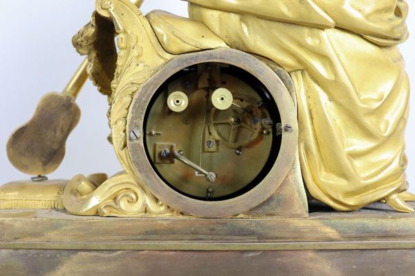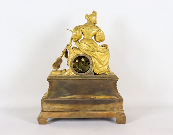 Antique French table clock in gilded and chiseled bronze with a sculpture of a young lady with mirror and guitar