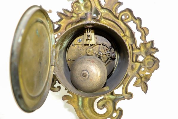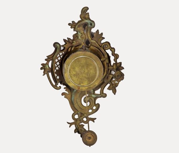 Antique small French cartel clock in gilded and chiseled bronze with Louis XV motifs