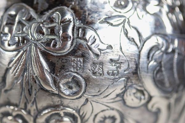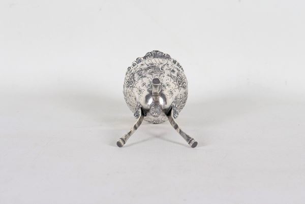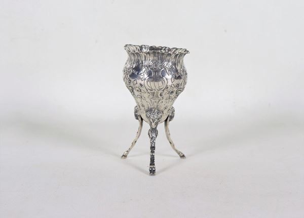 entirely chiseled and embossed, supported by three legs in the shape of goat heads, diameter 7.5 x 14 h.
