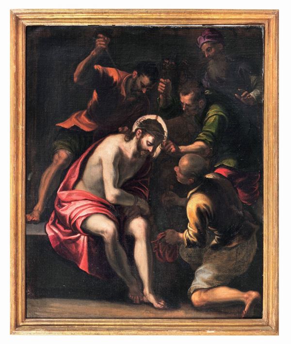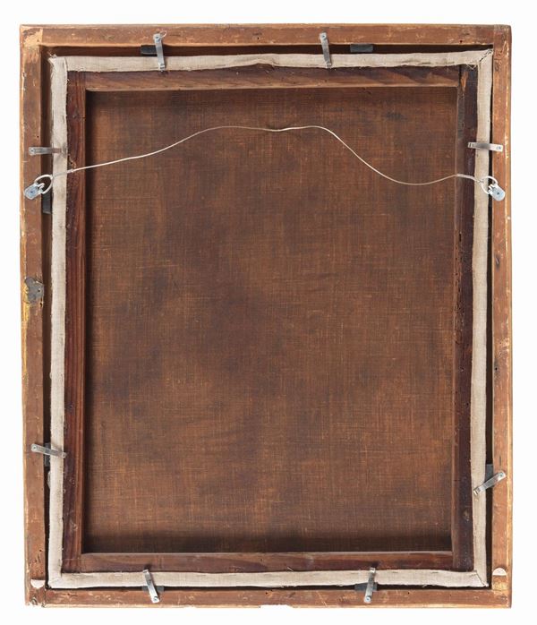 of excellent pictorial realization with large brushstrokes, a strong chiaroscuro effect and an application of color that is always full-bodied and vivid in the lacquer reds. Antique frame in gilded wood, 74 x 61 cm.