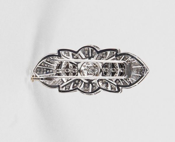 Brooch in 750 white gold, Decò design with a series of brilliants and enamels, which can also be used as a fastener for a three-strand necklace. [..]